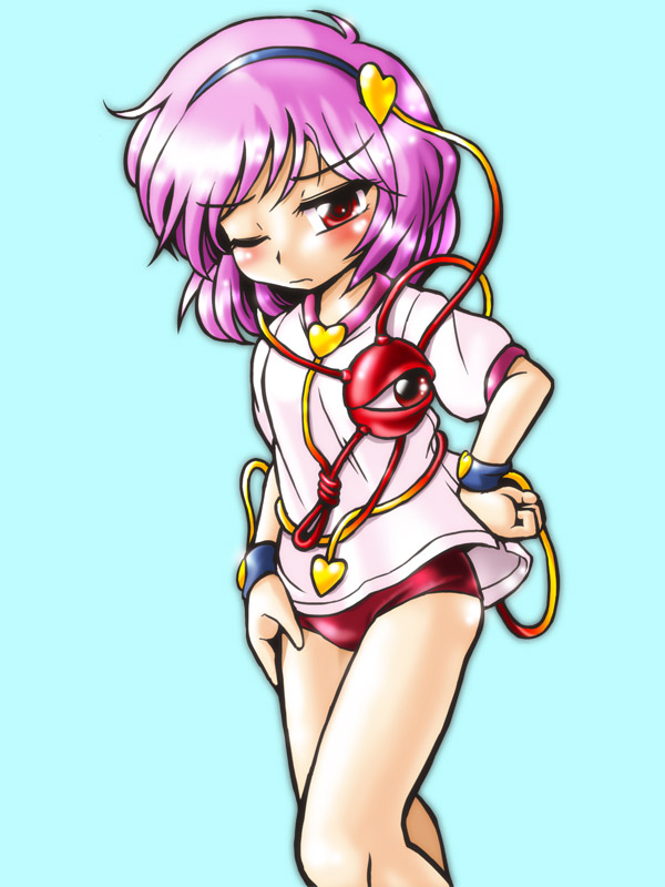 1girlalternate costumeblushburumafemale focusgym uniformhairbandone eye closedpurple hairred eyesshort hairsimple backgroundsolowink