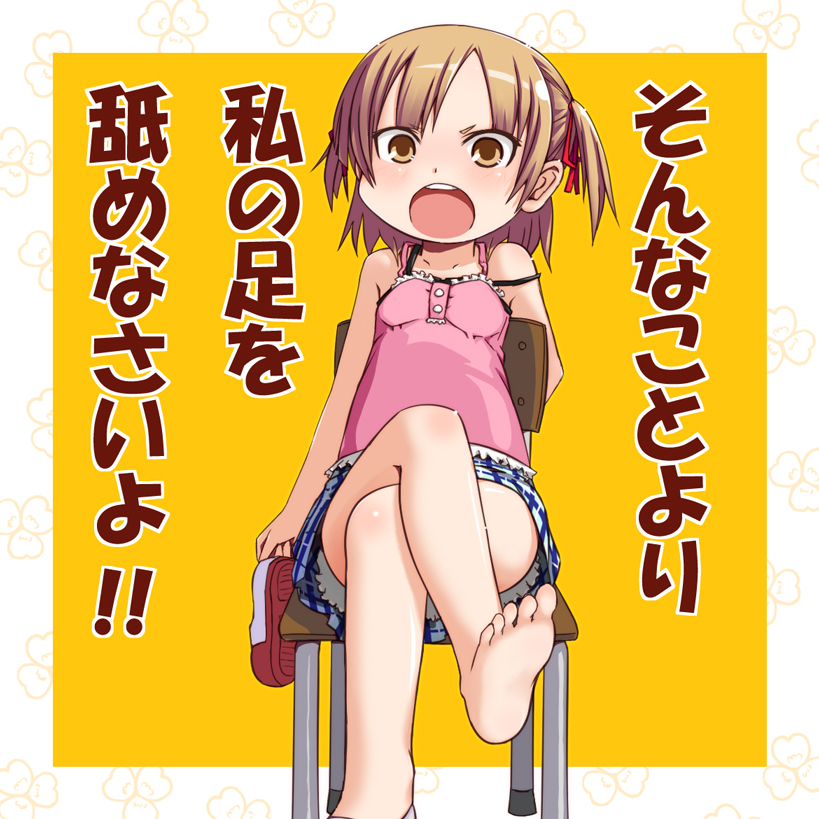 1girlassertive femalebarefootbellyblushbreastsbrown eyesbrown hairchairchildcrossed legsfeetfemale focusfoot focusholdingholding shoesholding unworn clothesopen mouthplaid clothesplaid skirtplumpshoesshort twintailssingle shoesittingskirtsmall breastssolessolotoestwintailsunworn shoes