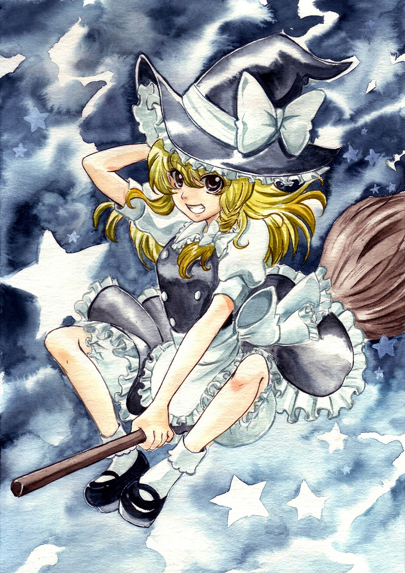 1girlblonde hairbraidbroombroom ridingbrown eyesfemale focusfull bodyhairbandhatoutdoorsshort hairside braidskysolostar (symbol)witchwitch hat