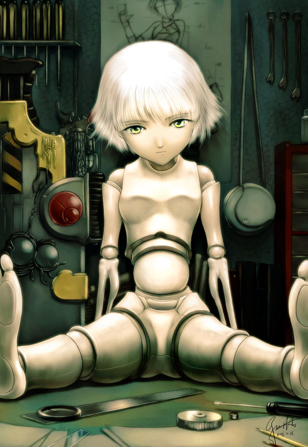 androiddolldoll jointsexpressionlessjointsrobot jointsshort hairsittingsolowhite hairyellow eyes