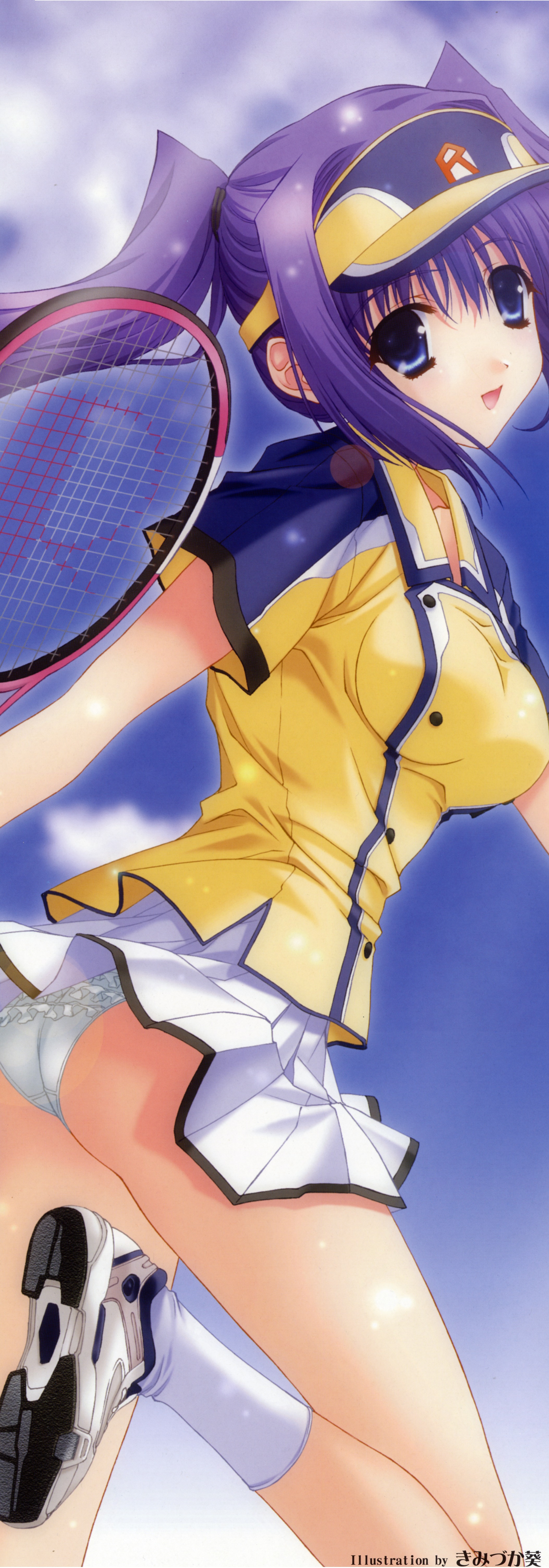 1girlassblue eyesbreastsclothes writingfemale focusfrilled pantiesfrillslarge breastspantiespantyshotponytailpurple hairracketshoesskirtsneakerssockssolosportswearstick postertennis rackettennis uniformtwintailsunderwearvisor capwhite panties