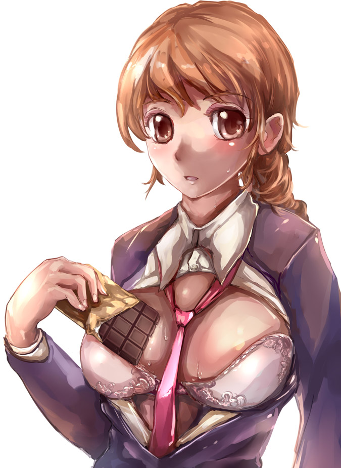 1girlbrabreastsbrown haircandychocolatechocolate barcleavagefemale focusfoodlarge breastslingerienecktieopen clothesopen shirtponytailschool uniformshirtsolounderwear