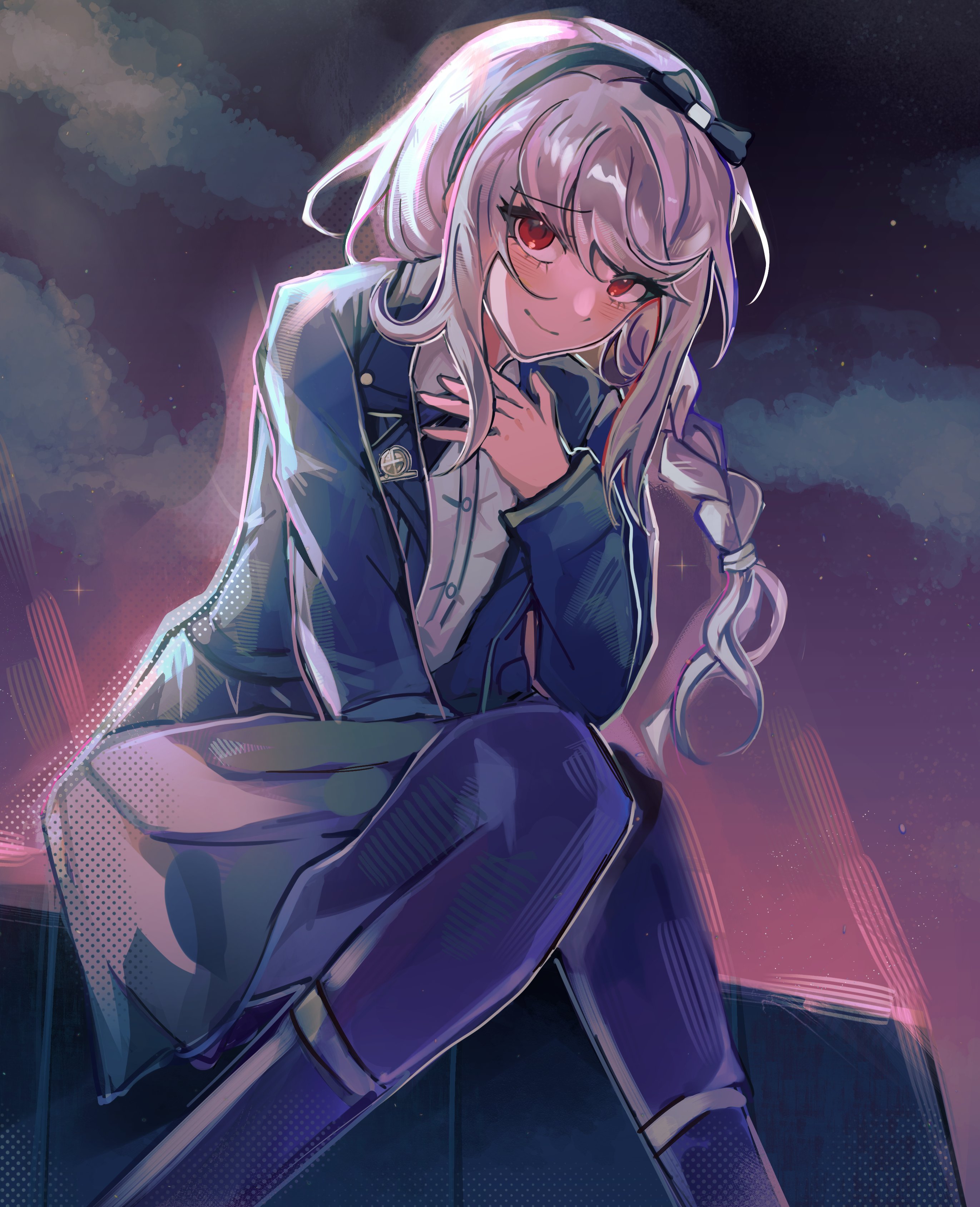 1girlblack bootsblack pantyhoseblack ribbonblack skirtbootsbraidclosed mouthcloudgrey hairhairbandhand on own chestjacketlimellomslong hairneck ribbonnightnight skyopen clothesopen jacketotomegmefoxypantyhosered eyesribbonshirtsittingskirtskysmilesolowhite shirt