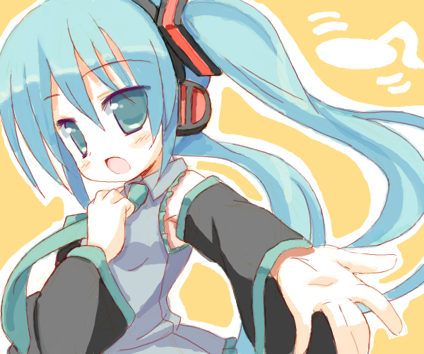 1girlaqua eyesaqua hairblushdetached sleevesdress shirtfemale focusfull bodyheadphoneslong hairlong sleevesnecktieopen mouthoutstretched armshirtsimple backgroundsolotwintails