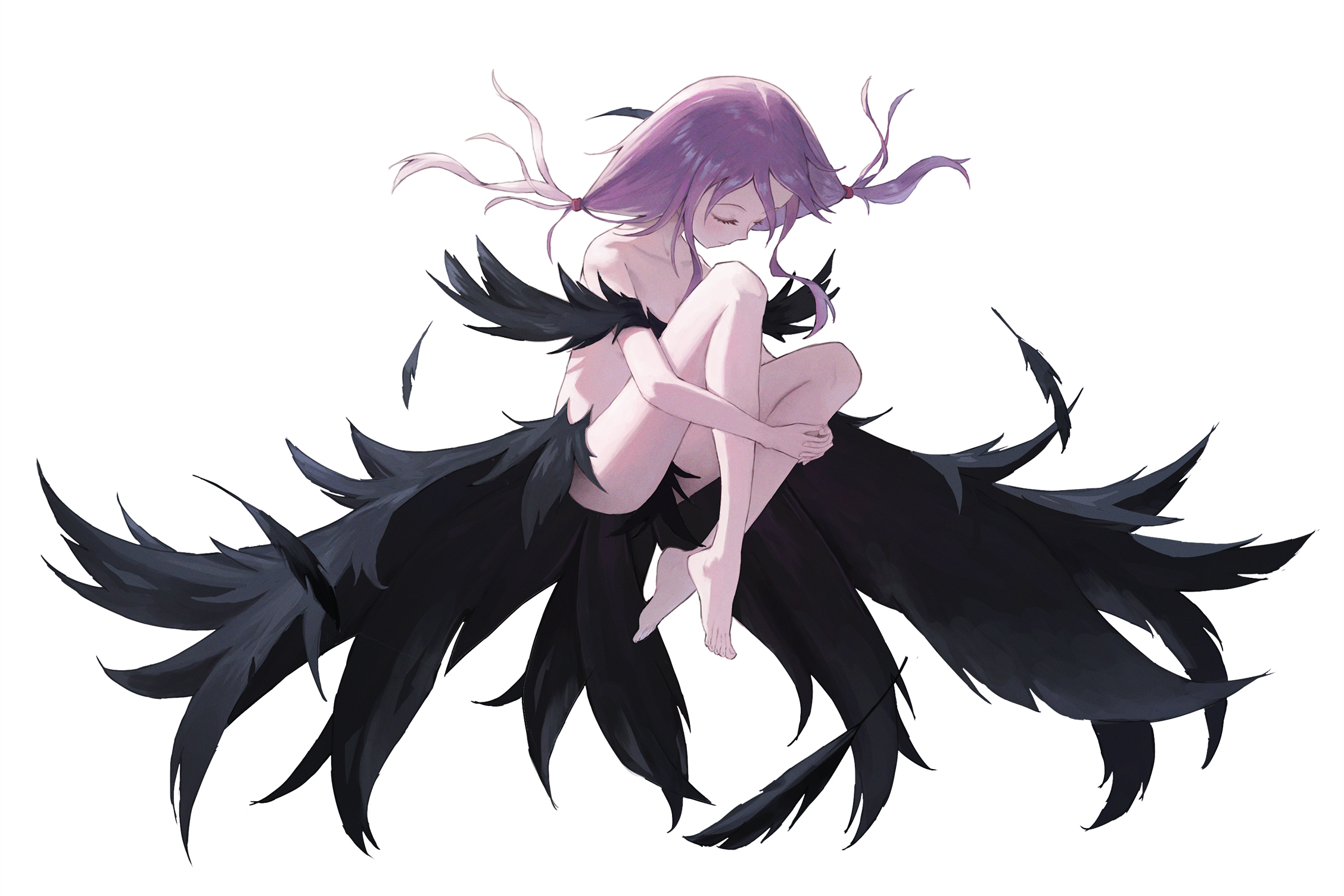 1girlblack feathersclosed eyesfeathersfetal positionfull bodyhair tubeslow twintailsofficial alternate costumepink hairshadow 999simple backgroundsolotwintailswhite background