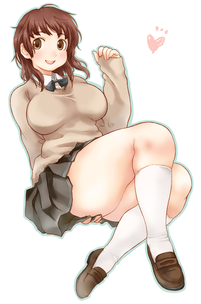 1girlbreastsbrown hairfemale focusheartlarge breastsplumpschool uniformskirtsockssolosweaterthick thighsthighs