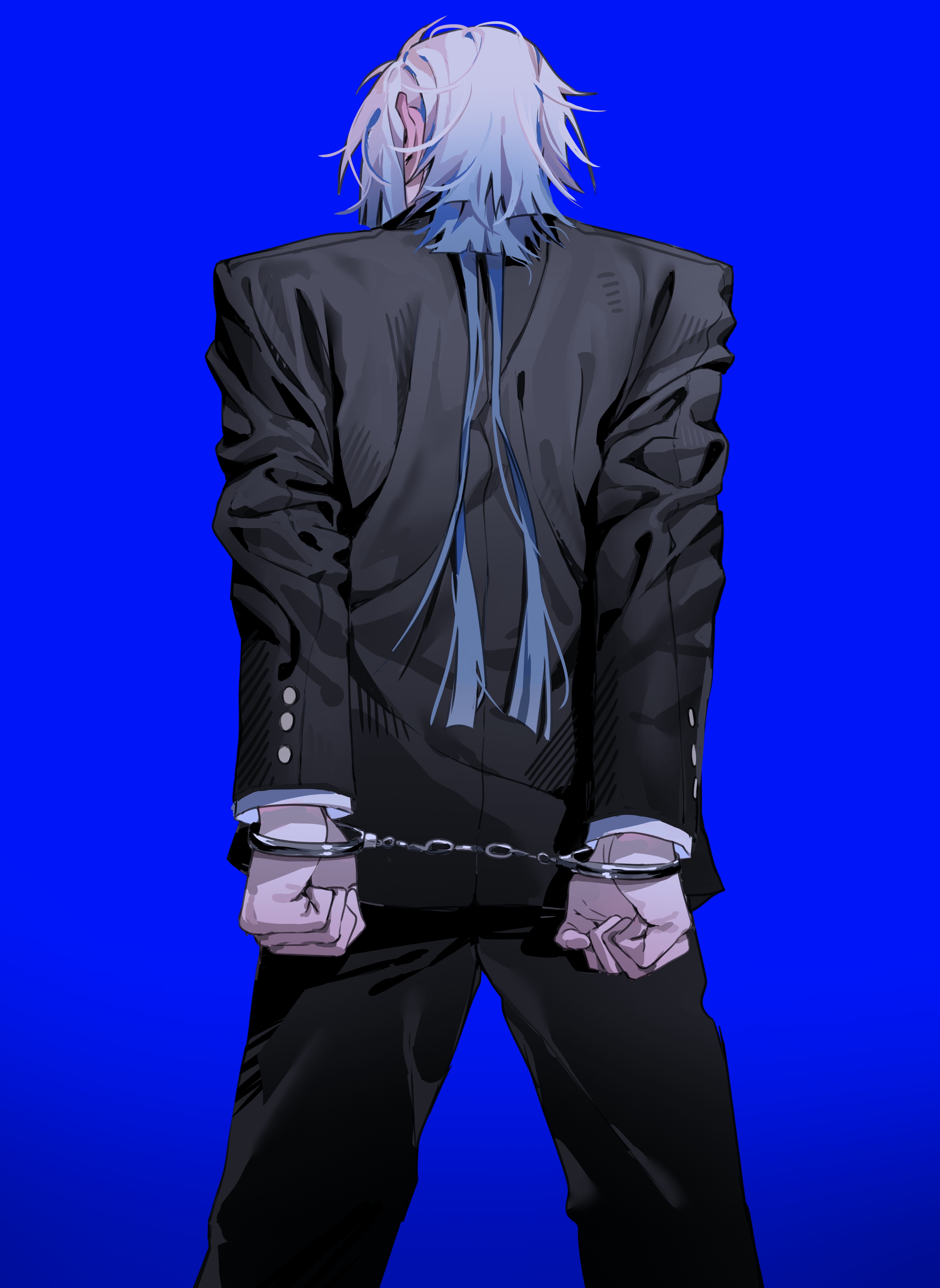 1boyblack pantsblonde hairblue backgroundblue hairbuttonscuffsfrom behindgakurangradient hairhandcuffslegs apartlong sleevesmale focusmulticolored hairpantsschool uniformshort hairshort hair with long lockssimple backgroundsolosulagaytwo-tone hair