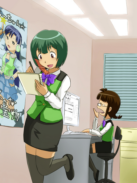 2girlsbowtiebraidbrown eyesbrown haircellphonecomputergreen hairleg uplong hairmultiple girlsnotebookofficeopen mouthphonepixiv thumbnailposter (object)short hairsittingtaremethighhighstwin braidswritingyawning