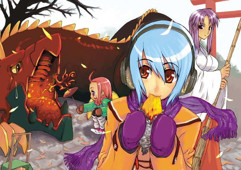 3girlsbroomdragonearmuffsfoodglovesjapanese clothesmikomultiple girlsroasted sweet potatoscarfsweet potatowinter