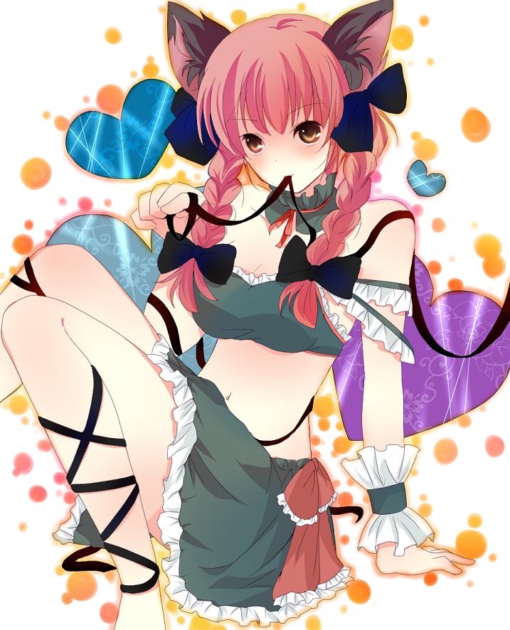 1girlanimal earsbraidcat earscat girlfemale focushair ribbonheartheart backgroundred eyesred hairribbonsolotwin braidswrist cuffs