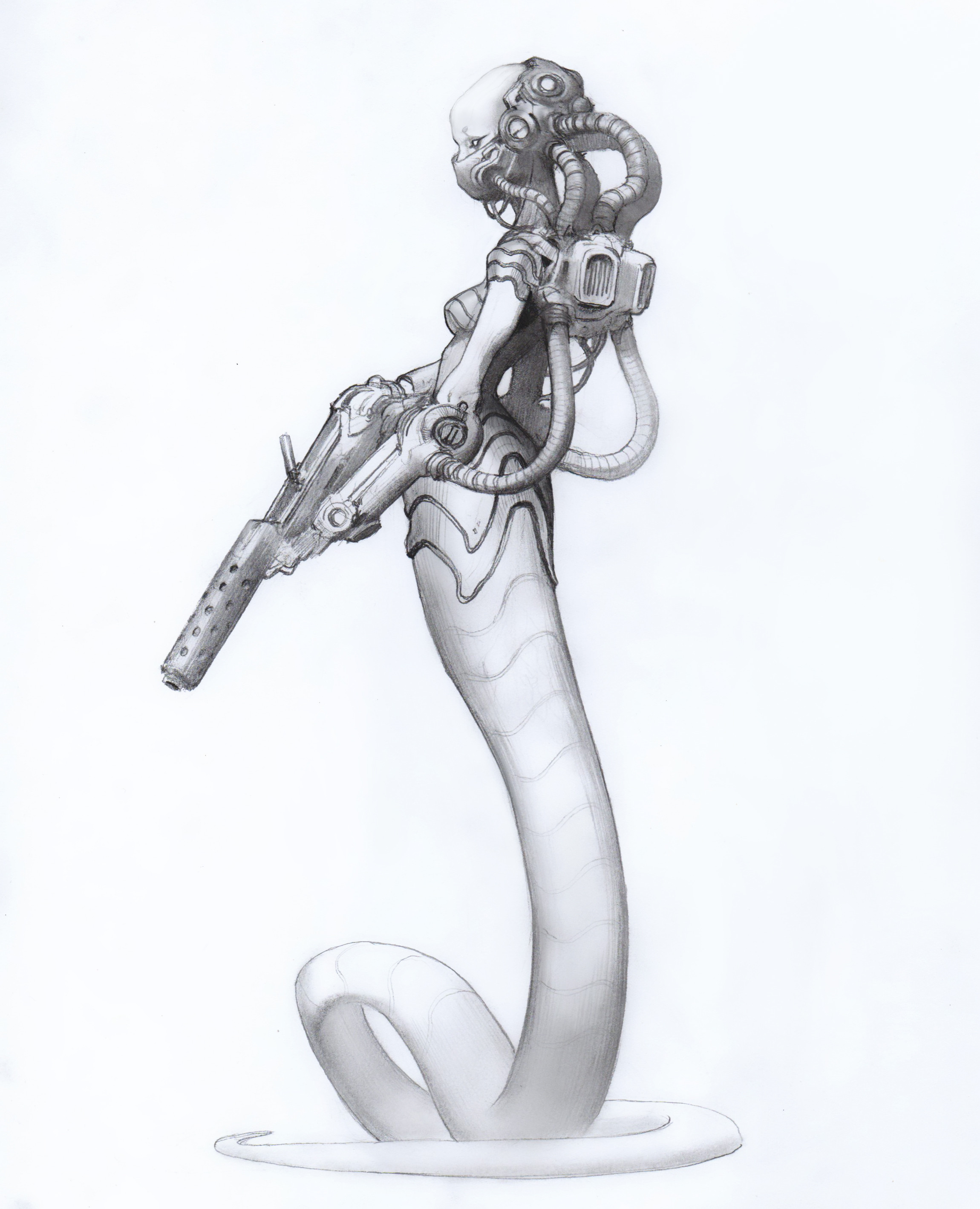 1girlarmorbackpackbagbaldbreastscablefauldsfrom sidegunholdingholding gunholding weaponlamialight machine gunmachine gunmaskmonochromemonster girlmouth maskscience fictionshoulder armorsimple backgroundsmall breastssnake tailsolid eyessolostandingtailtubevent (object)weaponwhite background