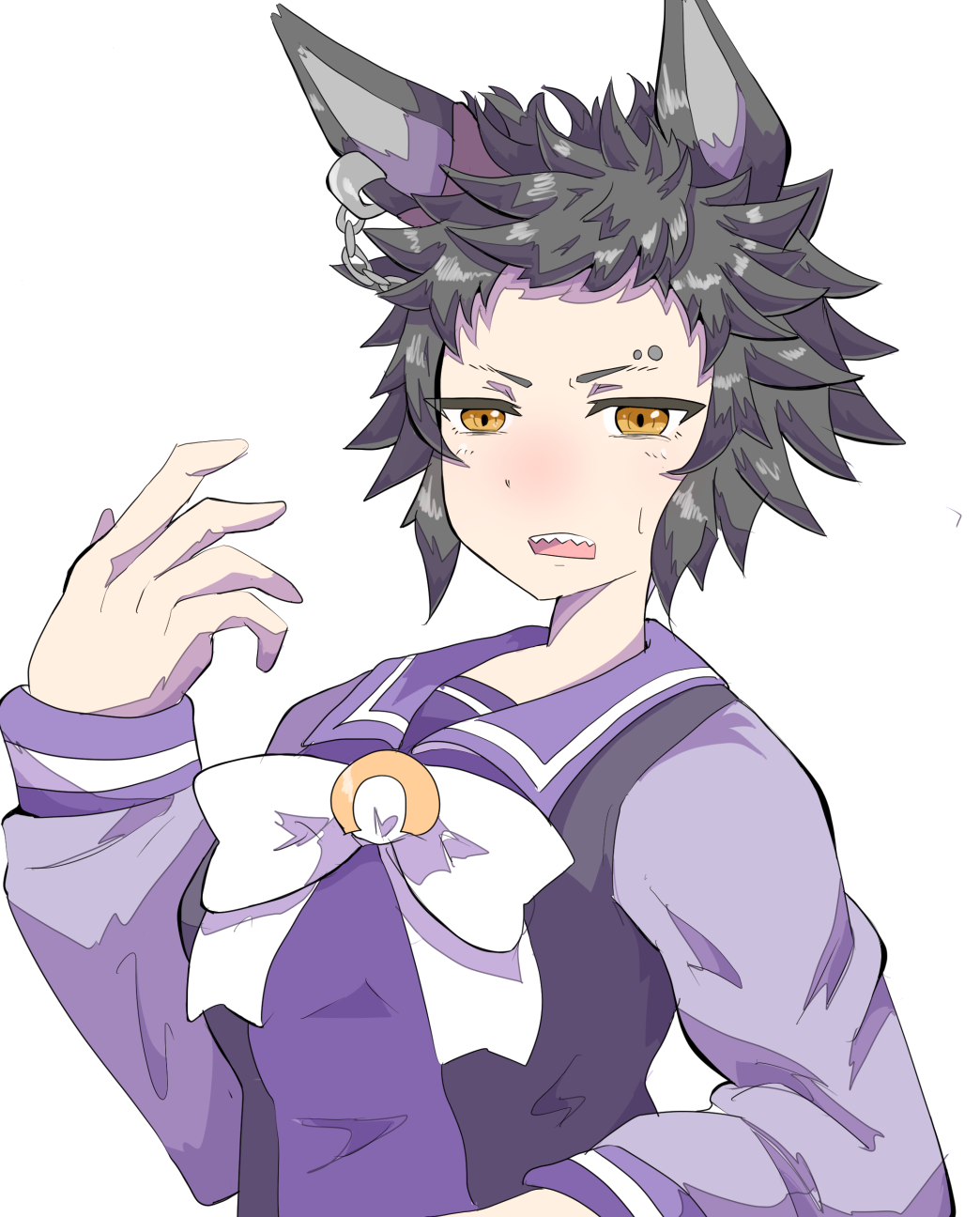 misumi uika, bang dream!, bang dream! it's mygo!!!!!, commentary, highres, 1girl, blonde hair, grey background, hair between eyes, medium hair, open mouth, purple eyes, shirt, simple background, solo, string, string of fate, upper body, white shirt, yu ux xy