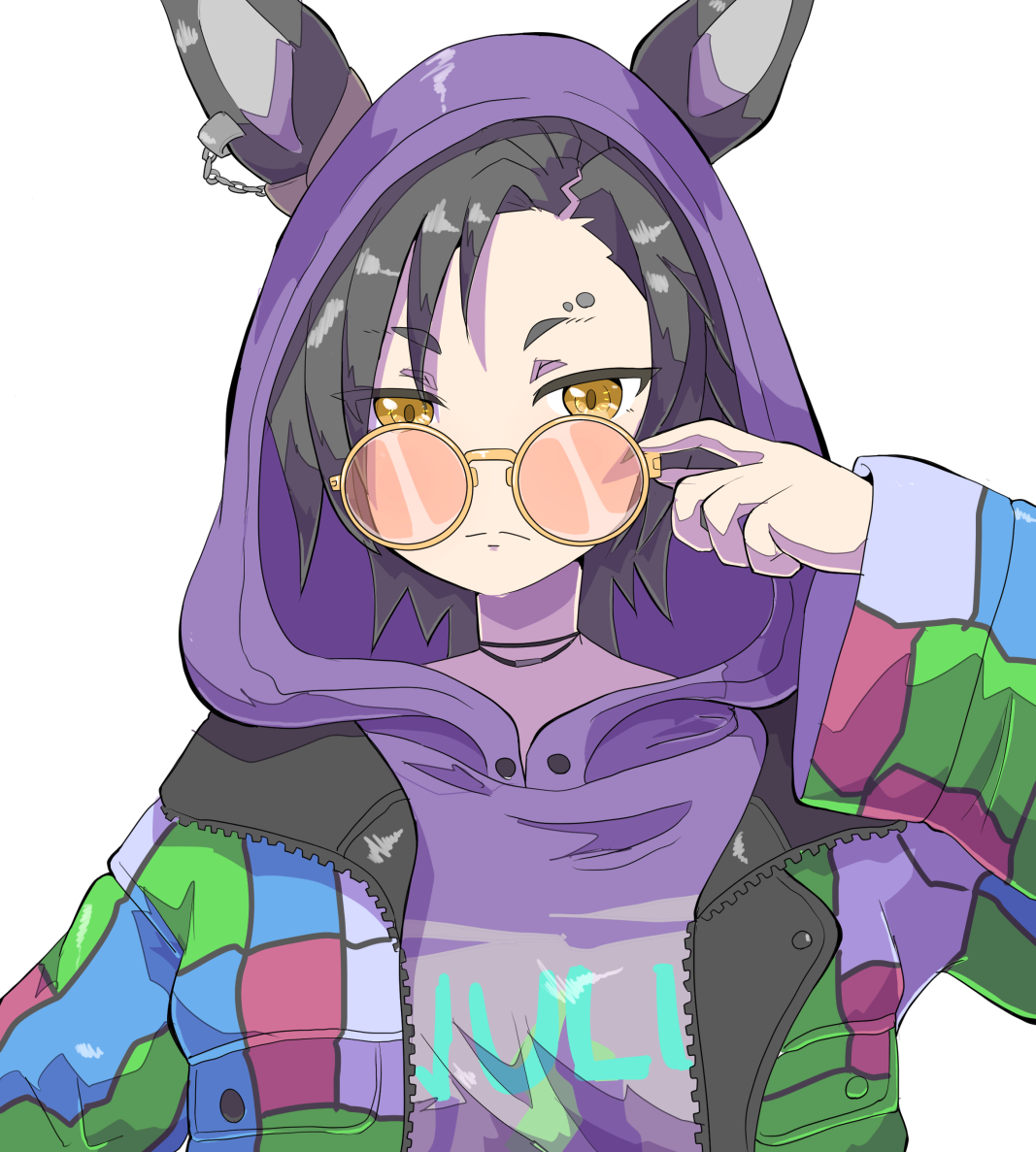 1girlanimal earsblack hairbrown eyesclosed mouthears through headweareyebrow piercingface piercinggreen jackethand uphoodhood uphoodiehorse earsjacketlong sleevesopen clothesopen jacketpiercingpink-tinted eyewearpurple hoodieround eyewearshort eyebrowssimple backgroundsleeves past wristssolothick eyebrowstinted eyewearupper bodyv-shaped eyebrowswhite backgroundwide sleevesyellow-framed eyewear