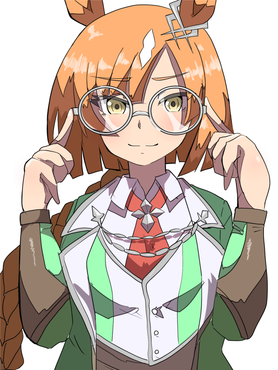 1girlanimal earsbraidbrown eyesbrown hairclosed mouthcollared shirtgreen jacketgrey-framed eyewearhands uphorse earsjacketlong hairlong sleeveslooking at viewermulticolored hairnecktieopen clothesopen jacketred necktieround eyewearshirtsingle braidsmilesolotwo-tone hairupper bodyvery long hairvestwhite hairwhite shirtwhite vest