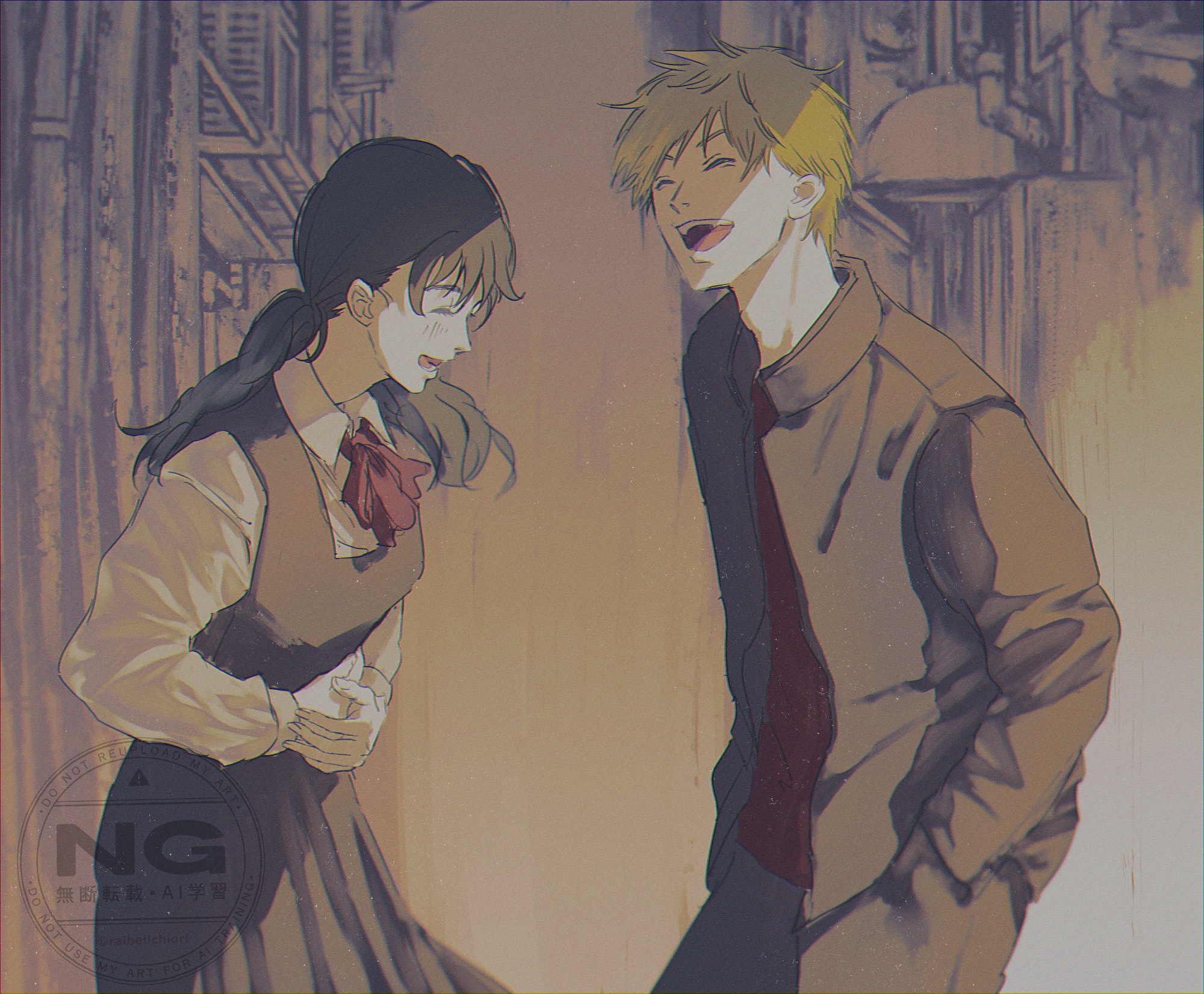 1boy1girlblack hairblonde hairbowgakuranhands in pocketsjapanese clotheslaughingponytailred bowschool uniformsmilewatermark