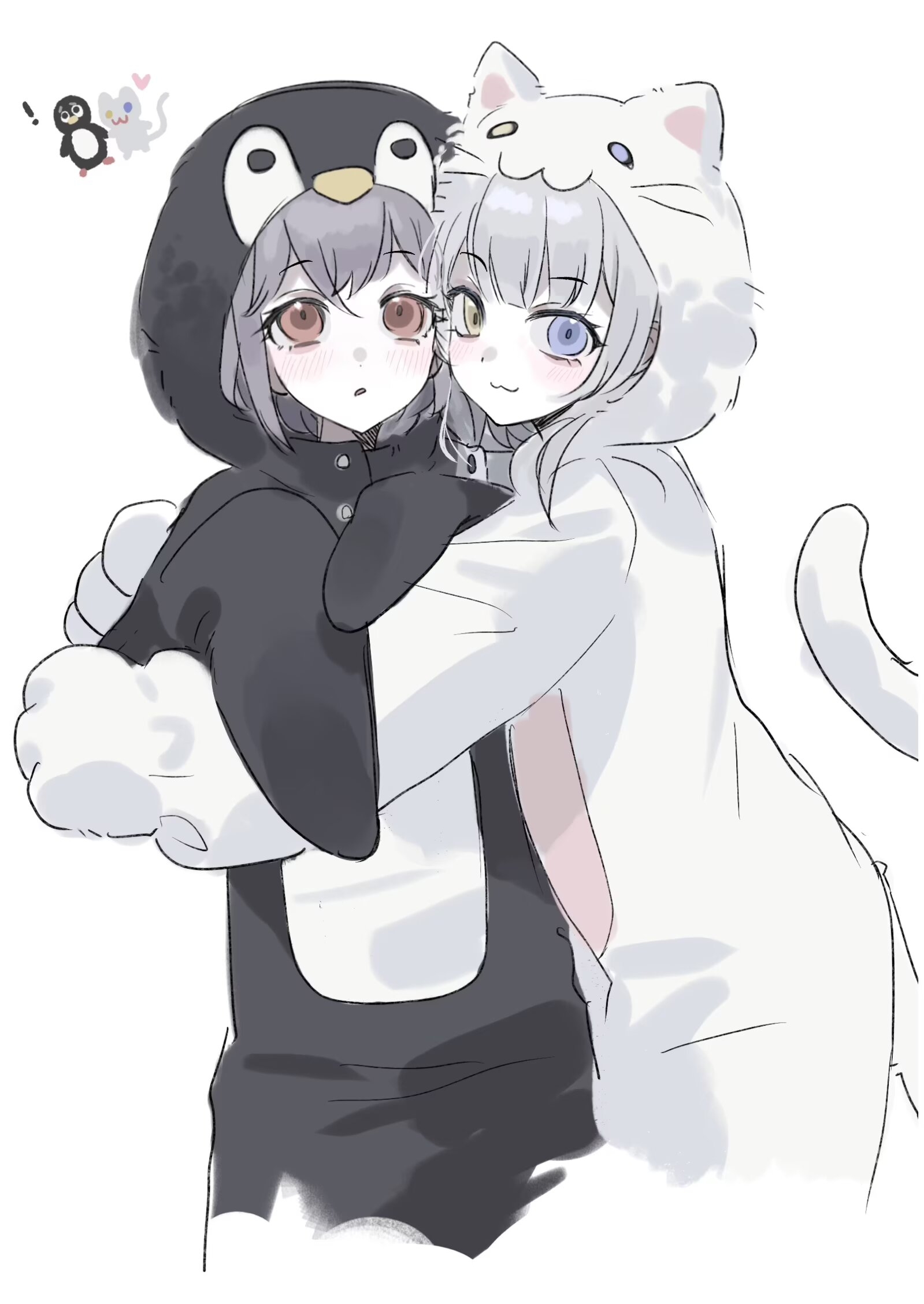 :3:o1boy2girlsanimal costumeanimal earsbirdblue eyesblushcatcat costumecat earscat tailclosed mouthcropped legscrossed bangsdoodle insetgrey hairhands upheads togetherheartheterochromiahug from sideleqing68425looking at viewermedium hairmultiple girlsparted lipspenguinpenguin costumered eyesshort hairside-by-sidesimple backgroundtailwhite backgroundyellow eyes