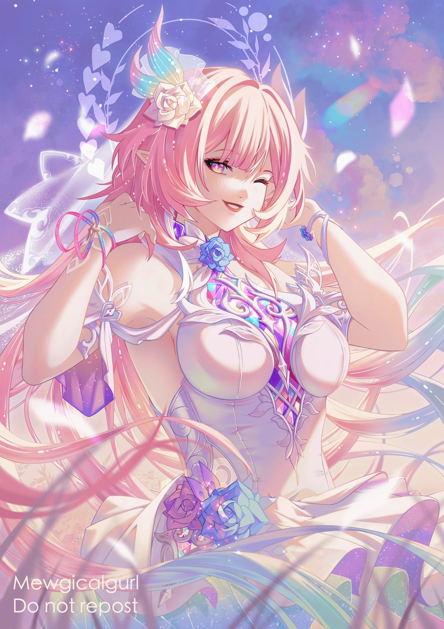 1boy1girlaqua hairbare shouldersblue skybreastsdiamond (shape)diamond-shaped pupilsdressflowergradient hairhair flowerhair ornamenthalolarge breastslong hairlooking at viewermulticolored hairone eye closedpink hairpointy earspurple eyesskysmilesolosymbol-shaped pupilsvery long hairwhite dresswhite hair