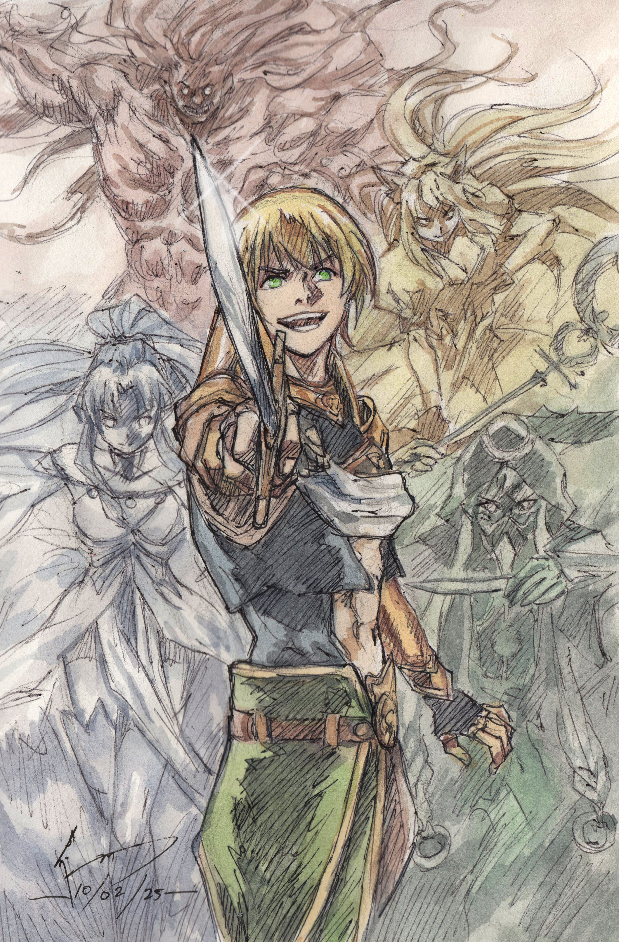 animal earsargonauts (fate)armorblonde haircat earsdressglovesgreen eyesholdingholding swordholding weaponjewelrylong hairlooking at viewermale focusmultiple boysmuscularmuscular malenoble phantasm (fate)pointing melee weaponpointing swordpointy earsponytailsmilesolo focusswordvery long hairweapon