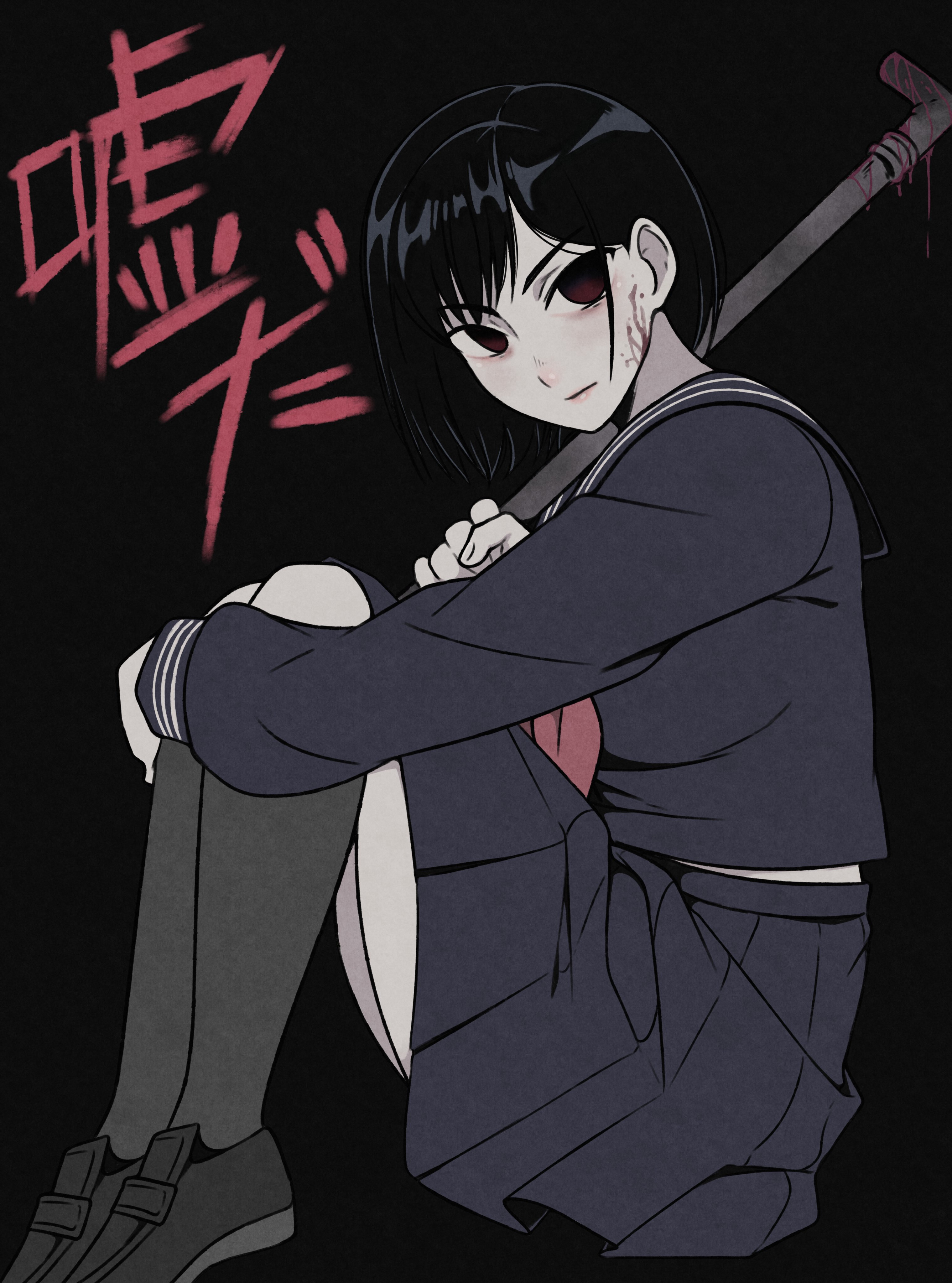 1boy1girlblack backgroundblack sailor collarblack serafukublack shoesblack skirtblack socksbloodblood dripblood on faceblood splatterbob cutbreastsbrown eyesclosed mouthdrippingempty eyesexpressionlessfrom sidefull bodyhair behind earhand on own legholdingholding lead pipehugging own legsimprovised weaponkneehighsknees uplarge breastslead pipeloaferslong sleeveslooking at viewerlooking to the sideloose hair strandmidriff peekneckerchiefon groundpale skinpleated skirtred neckerchiefsailor collarschool uniformserafukushoesshort hairsimple backgroundsittingskirtsockssoloswept bangs