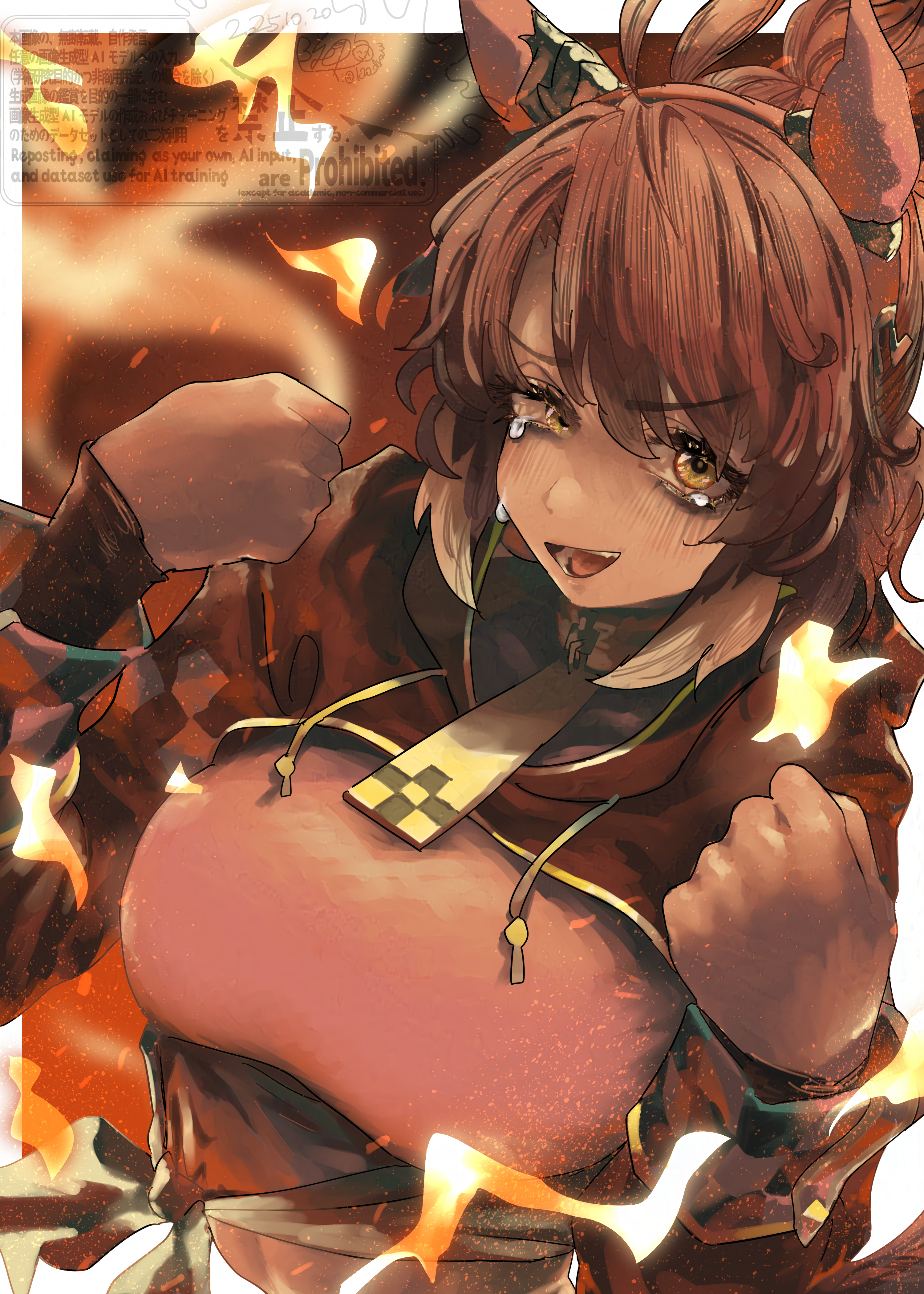1girlahogeanimal earsblack shrugblushbowbreastsbrown eyesbrown haircheckered ribboncryingdantsu flame (center spotlight) (umamusume)ear coversear ornamentear ribbonfirehair between eyeshorse earshorse girllarge breastslooking at viewermulticolored hairopen mouthpink shirtshirtshrug (clothing)smilesolotearsteethtied shirtupper bodywhite hairwhite shirt
