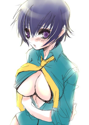 blue hairblushbreastslarge breastsnecktieno braopen clothesopen shirtpurple eyesshirtshort hairsolo
