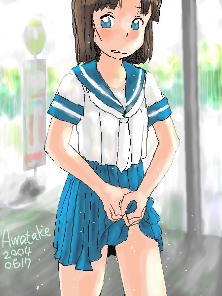 00s1girl2004artist nameblue eyesblushbrown hairdatedembarrassedfemale focusoutdoorsparted bangsshort hairskirtsolowetwet clotheswringing clothes