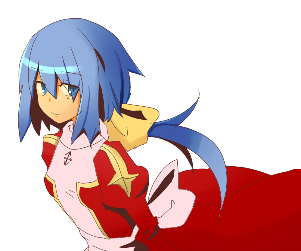 1girlblue eyesblue hairbowclosed mouthcowboy shotcrosscross necklacedressgrey dressgrey sashhair bowjewelryjuliet sleeveslong hairlong sleeveslooking at viewerlow ponytailnecklaceponytailpuffy sleevesred dresssimple backgroundsmilesolotwo-tone dresswhite backgroundyellow bow