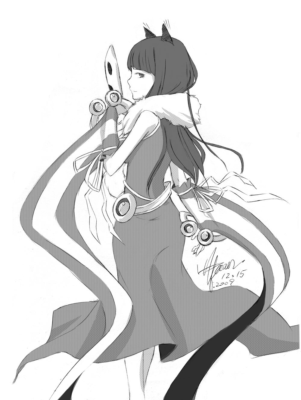 1girlanimal earsbeltcat earscat girlclosed mouthdateddetached sleevesdressfeet out of framefrom behindgreyscaleholdingholding masklong hairlooking at viewerlooking backmaskmonochromesimple backgroundsleevelesssleeveless dresssmilesolostandingstriped sleeves