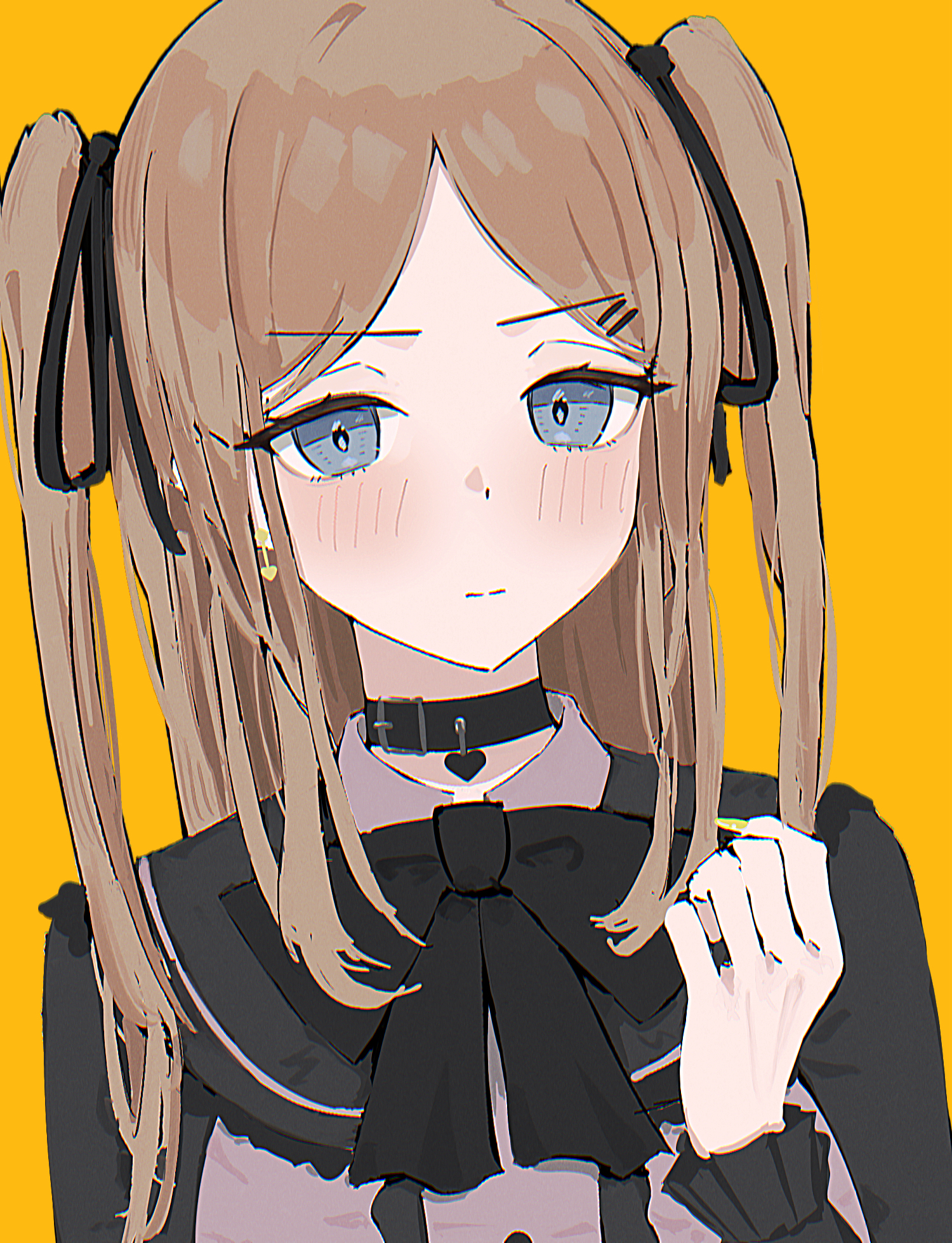 1girlblack bowblack bowtieblack chokerblack ribbonblack shirtblue eyesblushbowbowtiechokerclosed mouthearringshair ribbonjewelryjirai keilong sleeveslooking at viewernail polishribbonshirtsimple backgroundsolosplit mouthtwo side upupper bodyyellow backgroundyellow nails