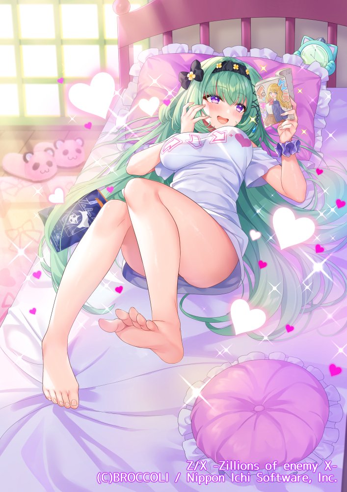 1girlalarm clockanimal slippersbarefootblack bowblack hairbandbookbowbreastsclockcopyright noticecushiongreen hairhair bowhair ornamenthairbandheartholdingholding bookindoorslong hairlyingon backon bedopen bookopen mouthpink slippersprint shirtpurple eyespurple scrunchiereachingscrunchieshirtslipperssolowindowwrist scrunchie