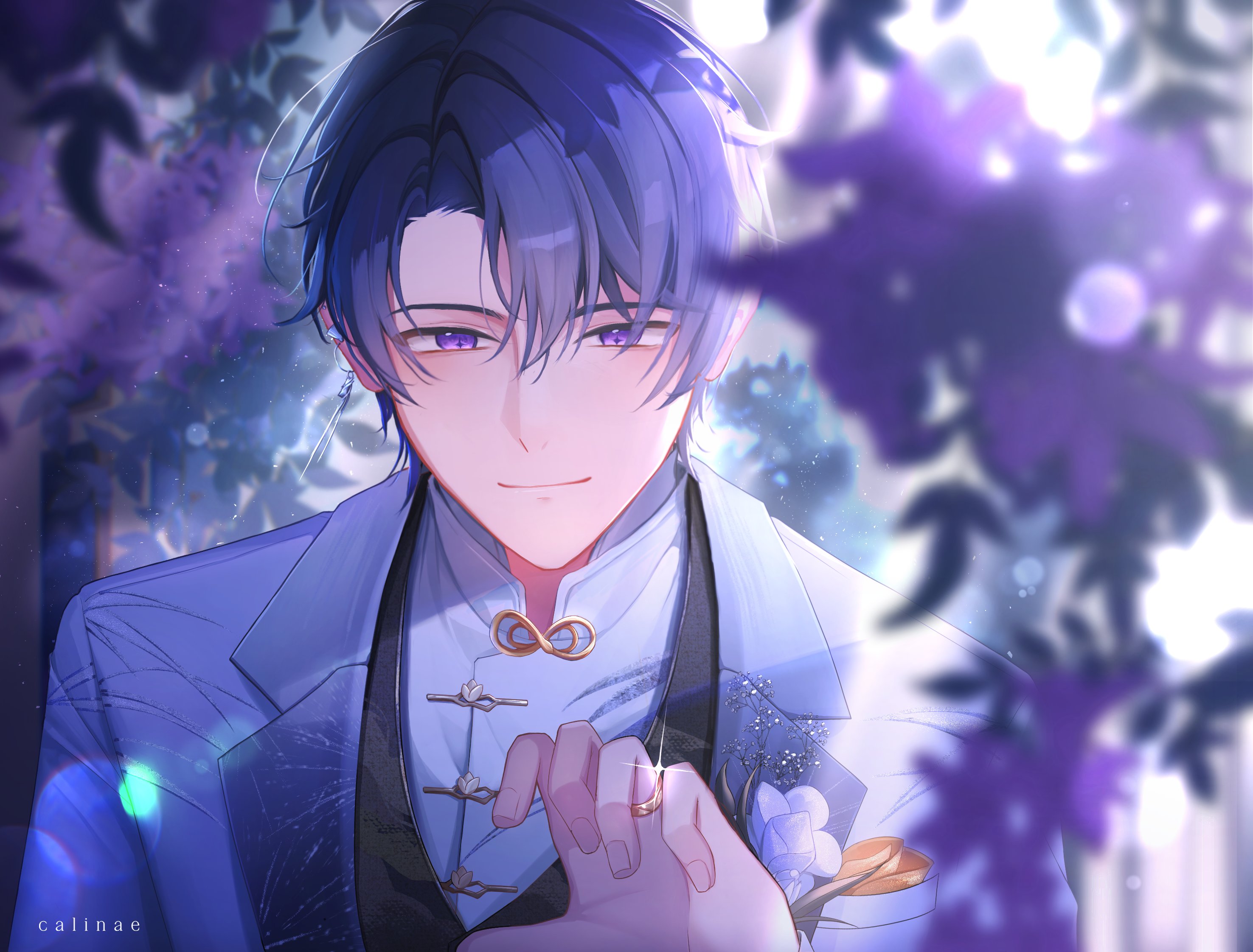 1boyblack vestblue hairblurryblurry foregroundclosed mouthdepth of fieldflowerglinthair between eyesjacketjewelrylooking at viewermale focuspurple eyespurple flowerringshirtsignaturesmilesoloupper bodyvestwhite jacketwhite shirt