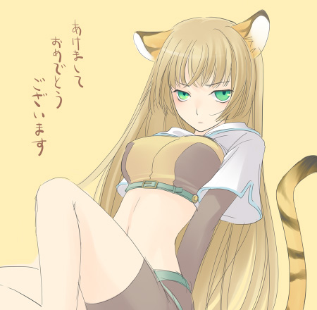1girlanimal earsarms behind backblonde hairbreastsbrown glovesbrown shirtbrown shortsclosed mouthcrop topcropped jacketelbow glovesfeet out of frameglovesgreen eyesjacketlong hairlooking at viewermedium breastsmidriffnavelshirtshort shortsshort sleevesshortssimple backgroundsittingsolotailtiger earstiger girltiger tailwhite jacketyellow background