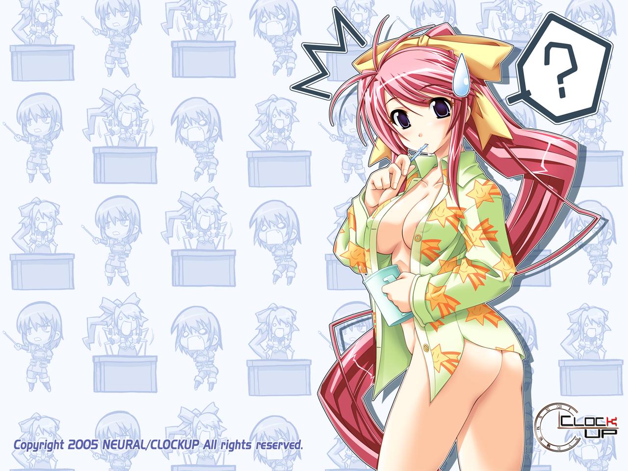 1boy1girlahogeassbreastscleavageno pantsopen clothesopen shirtpink hairponytailpurple eyesribbonshirt