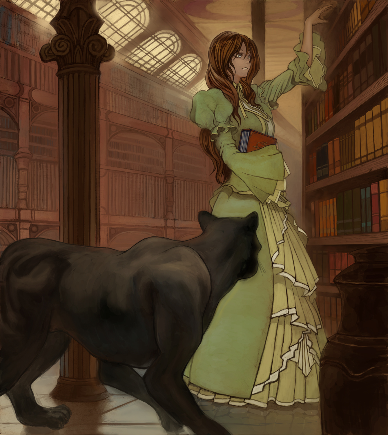 1girlanimalbookbrown hairdark skindark-skinned femaledressfemale focusgreen eyeslibrarypanthershelfsmilesolowindow