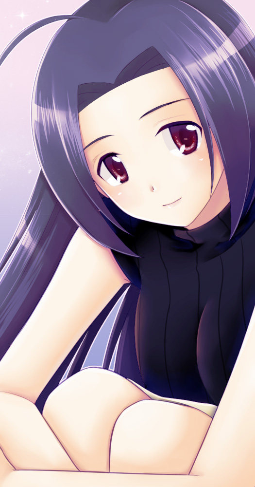 gunner-l, sonozaki mion, higurashi no naku koro ni, 00s, 1girl, black socks, blush, breasts, female focus, green hair, high ponytail, huge breasts, hugging own legs, long hair, looking at viewer, parted lips, ponytail, purple eyes, sitting, skirt, socks, solo
