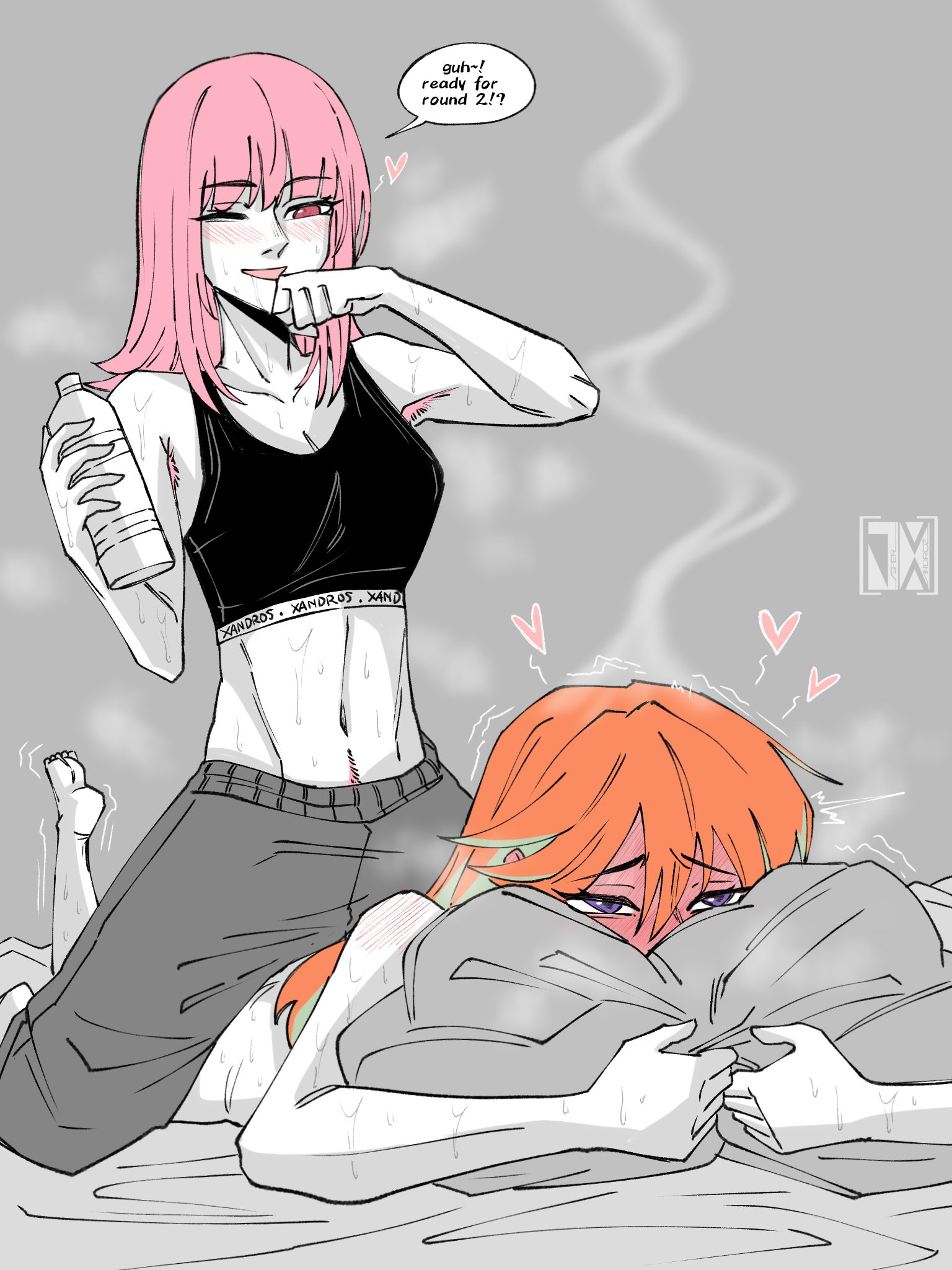 2girlsalternate costumearmpit hairbarefootblushbreastscouplegradient hairgreen hairlarge breastslong hairmulticolored hairmultiple girlsopen mouthorange hairpink hairpurple eyessmilestraddlingvirtual youtuber
