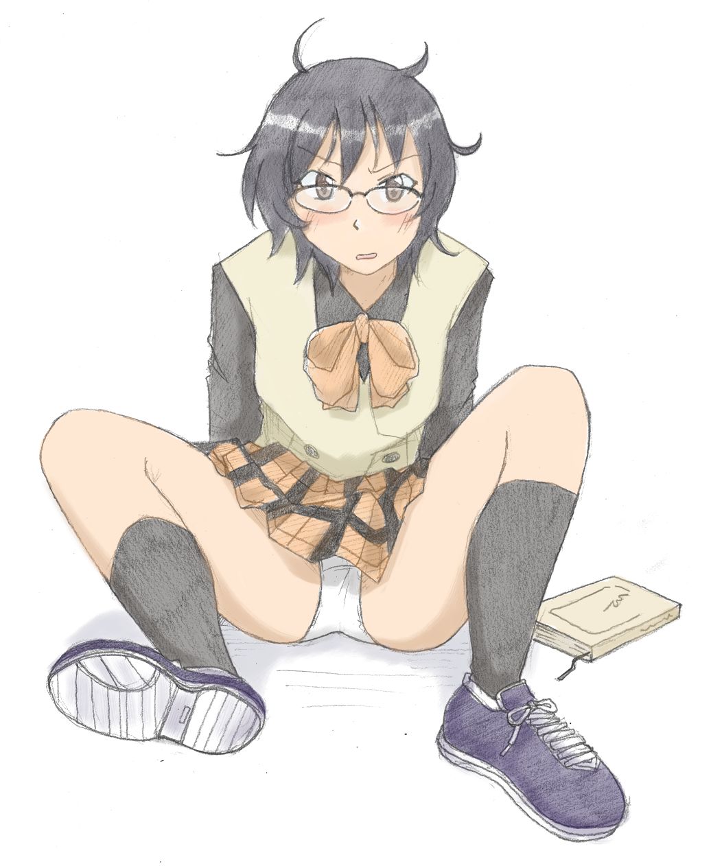 00s1girlblack hairblushbookfemale focusfull bodyglassespantiespantyshotplaid clothesplaid skirtschool uniformskirtsolounderwearupskirt