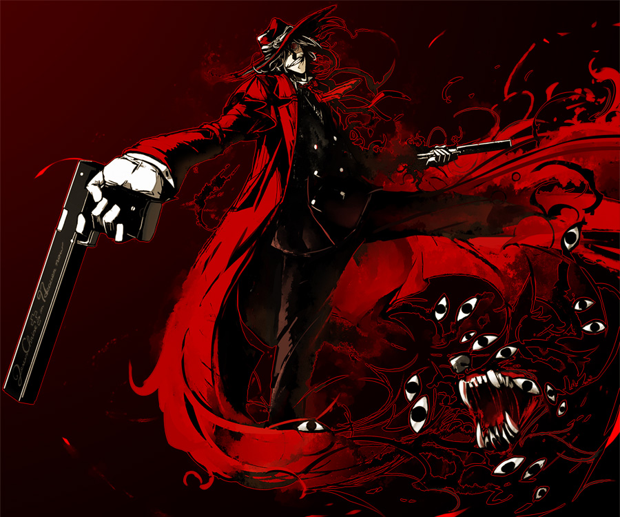 1boyblack haircasull (hellsing)coatdual wieldingextra eyesfalse armfalse limbfangsformal clothesglassesglovesgringunhandgunhatholdingjackal (hellsing)male focusnecktieovercoatpistolred coatred hatsmilesolosuitsunglassesvampireweaponwhite gloves