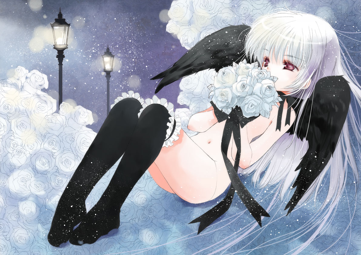 00sblack wingsbootsdoll jointsfeetflowerjointslamppostnavelnudepurple eyesred eyessolothigh bootsthighhighswhite hairwings