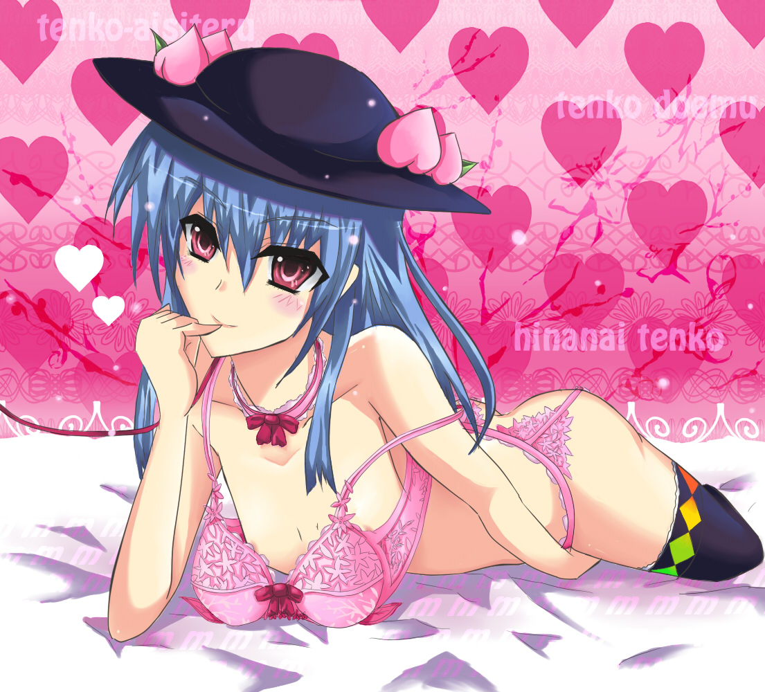 1girlbedblue hairbraenglish textfemale focusfinger to mouthflat chestfoodfruitgarter belthatheartheart backgroundlingerieno pantiespeachred eyessolothighhighsunderwear