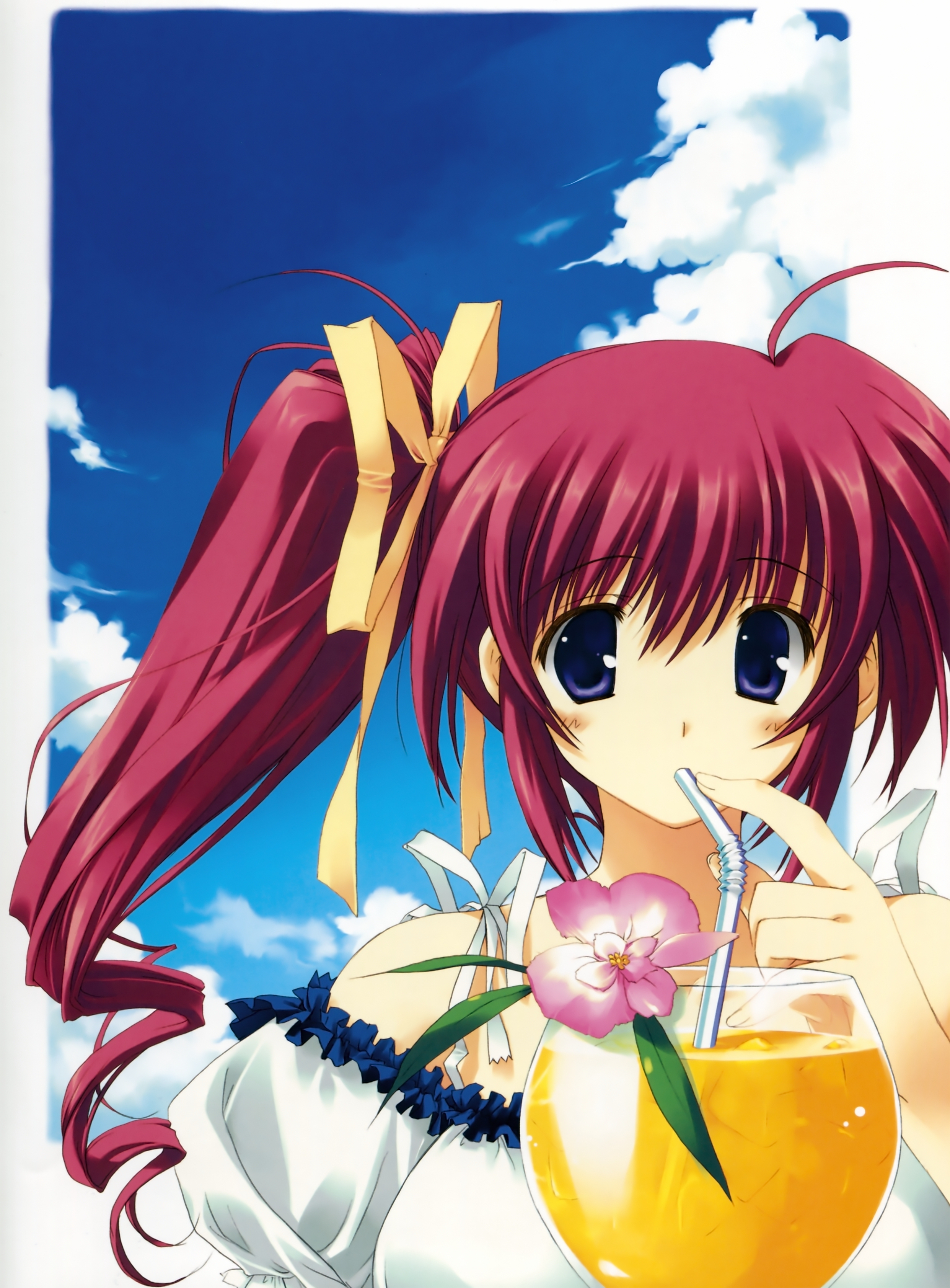 00s1girlbowclouddaydrinkdrinking strawfemale focusflowerhair ribbonlong hairpurple eyesred hairribbonside ponytailsoloyellow bow