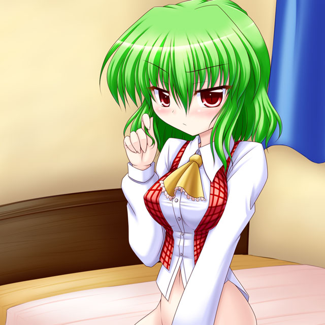 1girladjusting hairascotbedblushbottomlessbreastsfemale focusgreen hairmedium breastsno pantiesplaid clothesplaid vestred eyesshort hairslit pupilssolovest
