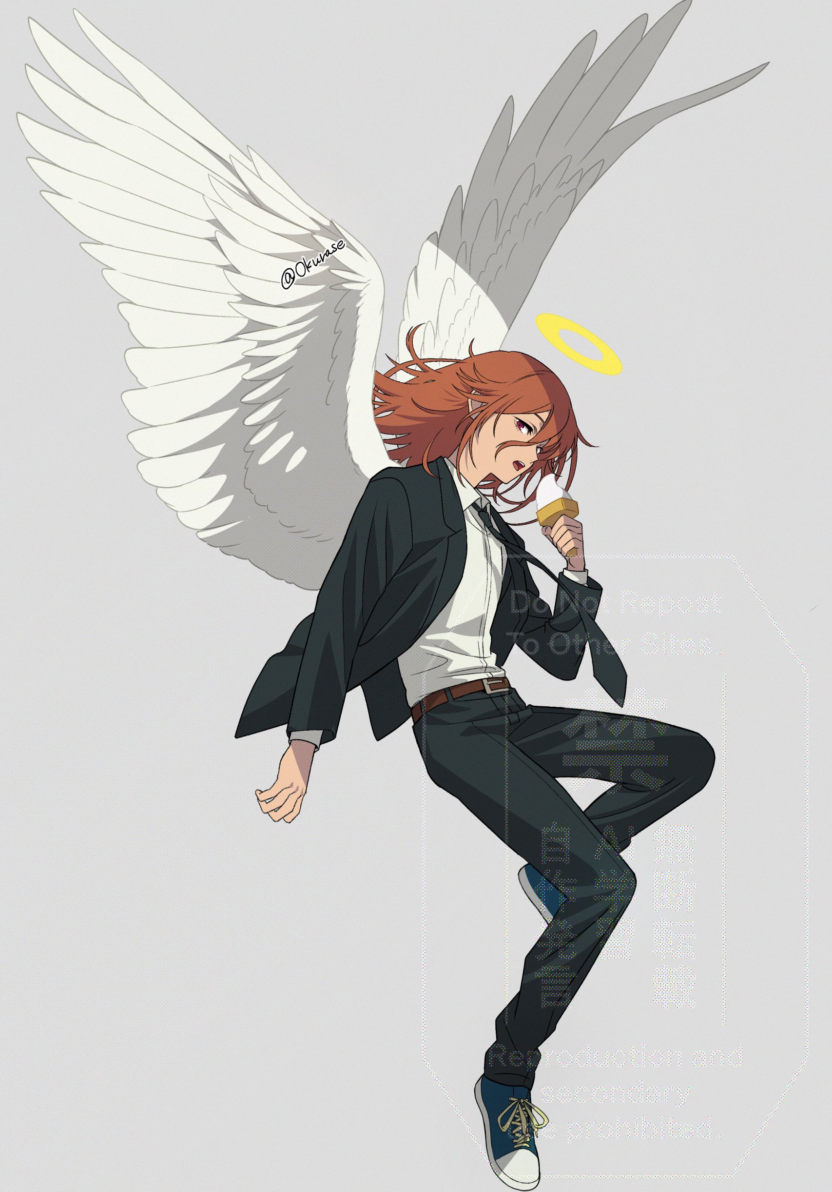 1boyangelangel wingsarm upbeltbelt buckleblack jacketblack pantsbrown beltbucklefeathered wingsfloating hairfoodfull bodygrey backgroundhaloholdingholding foodholding ice cream coneice cream conejacketlong sleeveslooking at viewermale focusmedium hairopen clothesopen jacketopen mouthpantsred hairshoelacesshoessolosuit jackettwitter usernamewatermarkwhite wingswings