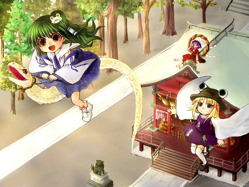 3girlschilddetached sleevesfemale focusflyinghatkomainumary janesmultiple girlsoutdoorsplantridingropeshimenawashoesshrinesittingsnakethighhighstree