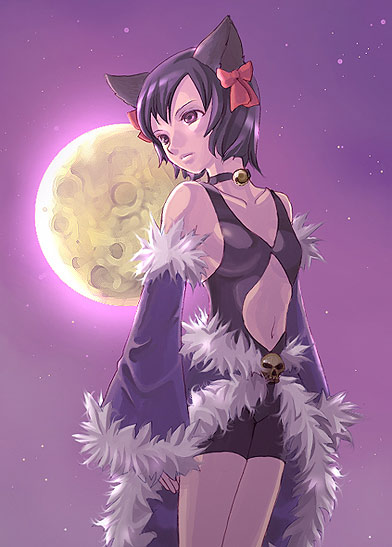 1girlanimal earsblack hairblack shortsblack tank topbowbreastscapecat earscat girlclosed mouthclothing cutoutcowboy shotdetached sleevesexpressionlessfull moonfur trimfur-trimmed capefur-trimmed sleeveshair bowlooking afarmoonnavelnightoutdoorspurple capepurple eyespurple skypurple sleevesred bowred eyesshort hairshort shortsshortsskullskysmall breastssolostar (sky)starry skystomach cutouttank topwaist cape