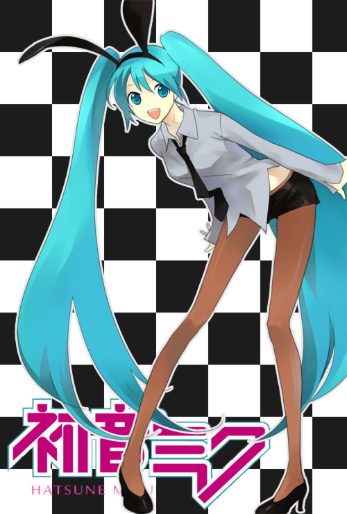 1girlanimal earsblue eyesblue hairfemale focushappylong hairmatching hair/eyesnecktiepantyhosepantyhose under shortsrabbit earsshortssolotwintailsvery long hair