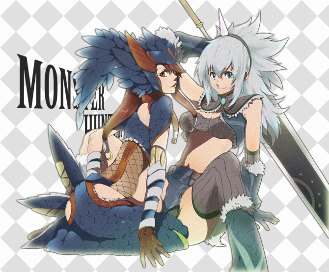 2girlsarmorhornshuge weaponkirin (armor)kneelingmidriffmultiple girlsnargacuga (armor)single hornsittingsmileswordthighhighsweapon