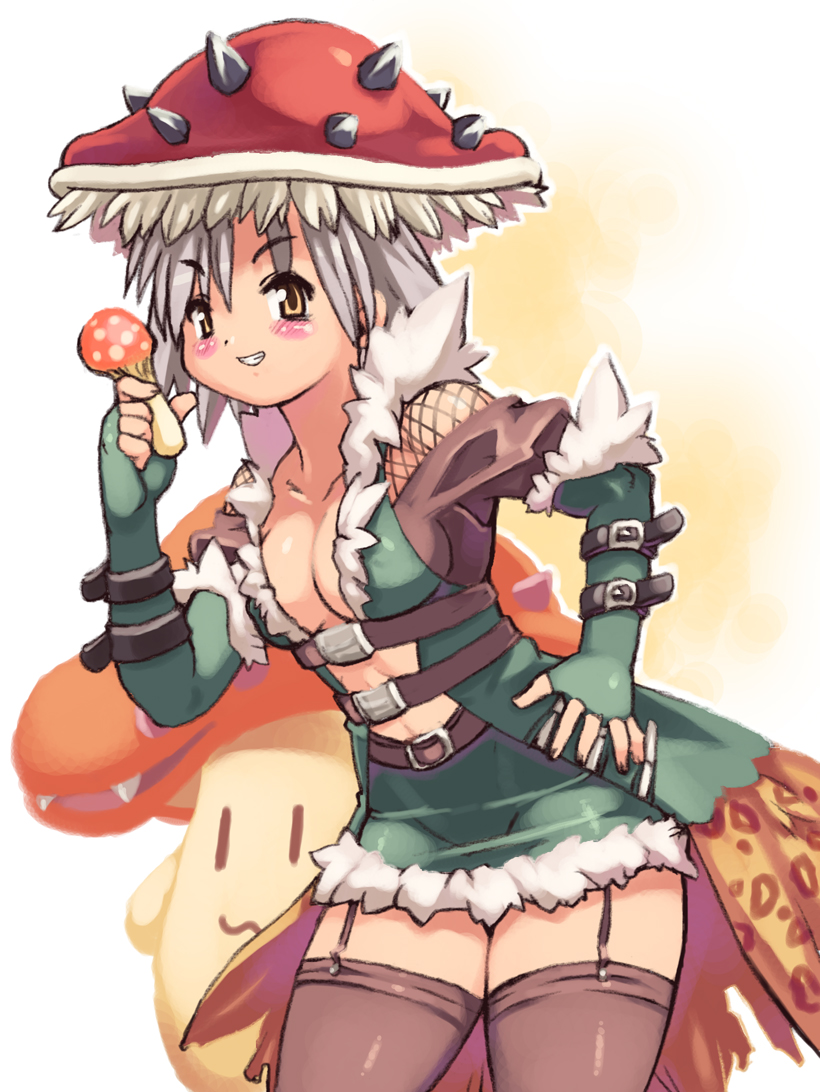 1girlalternate colorblushbreastsbrown thighhighscleavagecoatcowboy shotfingerless glovesgarter strapsglovesgreen coatgreen glovesgreen skirtgrey hairgrinhand on own hipleaning forwardlooking at viewermedium breastsminiskirtmushroommushroom hatopen clothesopen coatshort hairskirtsmilesolothighhighswhite backgroundyellow eyes
