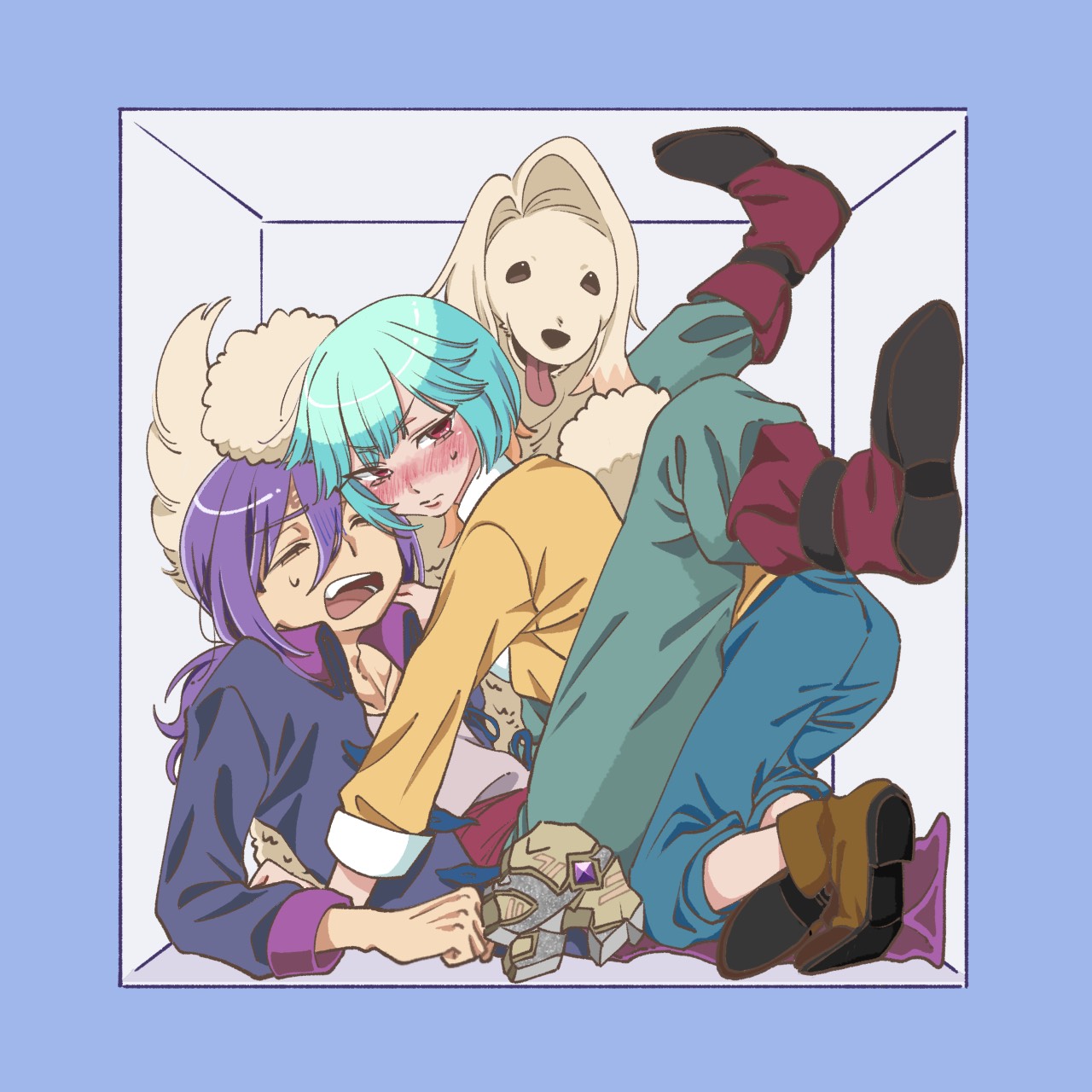2boysall foursblue pantsblushbootsboxbrown bootsdoghair between eyeshand on another's shoulderin boxin containerjacketlong hairlong sleeveslooking at viewermale focusmultiple boysopen clothesopen jacketpantspurple hairred bootsred eyessaburo (gekkan mousou kagaku)sasamehairuzoshirtshort hairsuzuki j. taroutanaka jiroutonguetongue outyaoiyellow shirt
