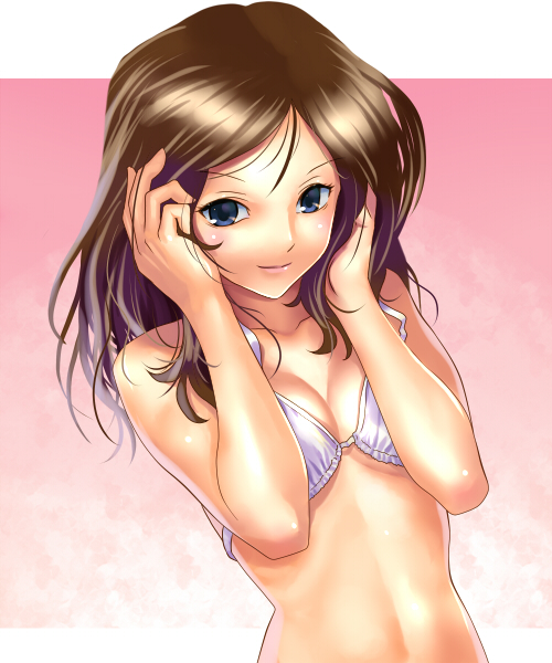 1girlbikiniblue eyesbreast pressbreastsbrown hairfemale focusmedium breastssoloswimsuitupper body